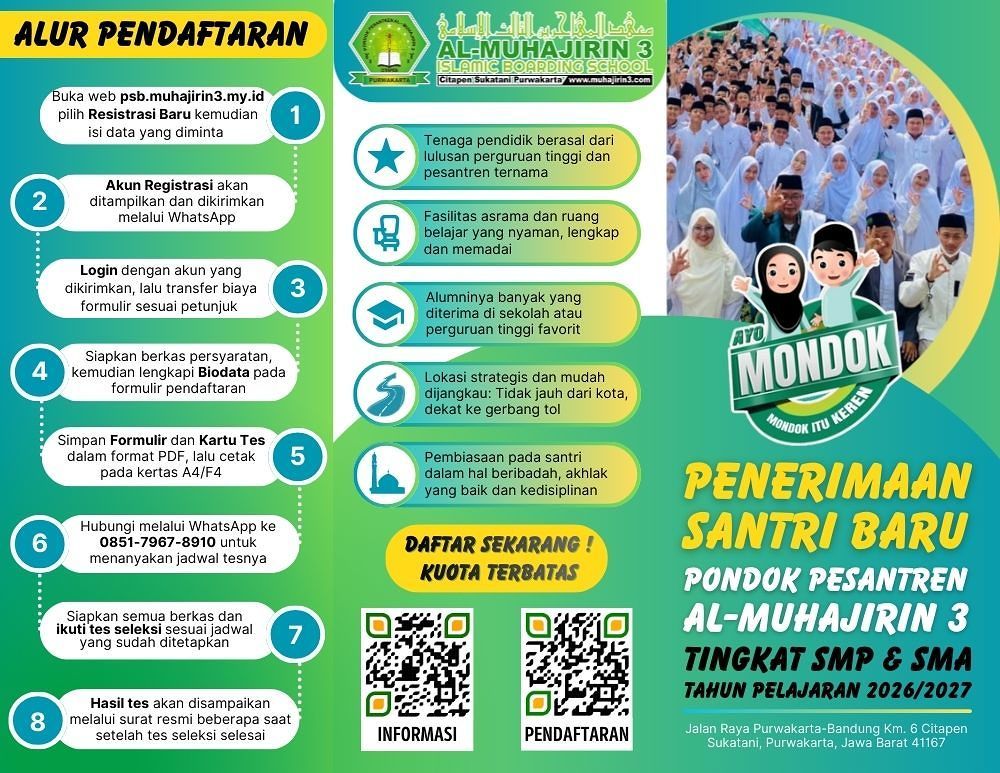 PURWAKARTA – Ratusan calon santri baru dari berbagai penjuru daerah memadati Aula Pondok Pesantren (Ponpes) Al-Muhajirin 3 Purwakarta untuk mengikuti tes seleksi Penerimaan Santri Baru (PSB) Tahun Pelajaran 2026/2027 Gelombang Pertama. Pelaksanaan tes yang diselenggarakan secara serempak pada Ahad, 7 Desember 2025, berlangsung dengan lancar dan t...