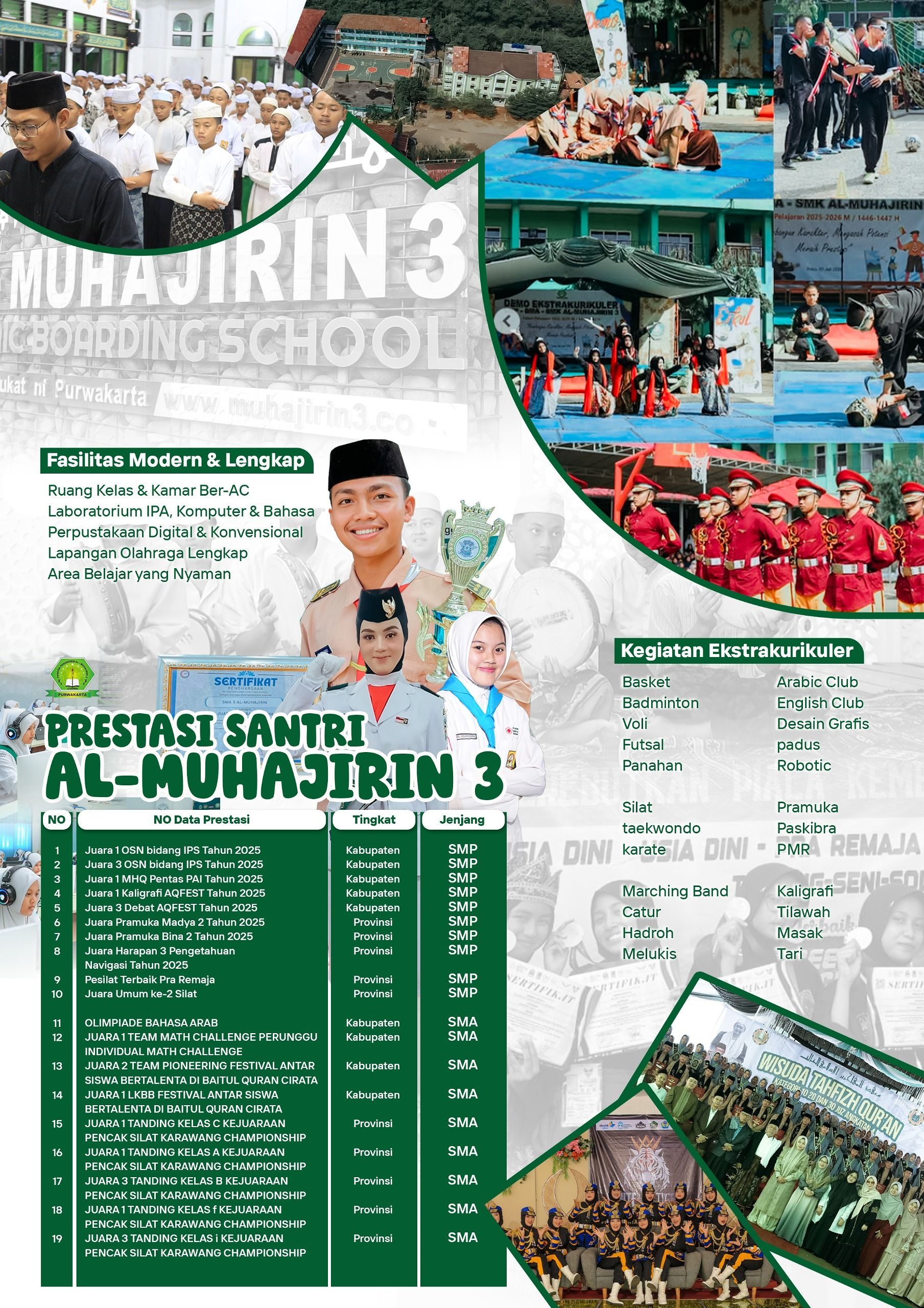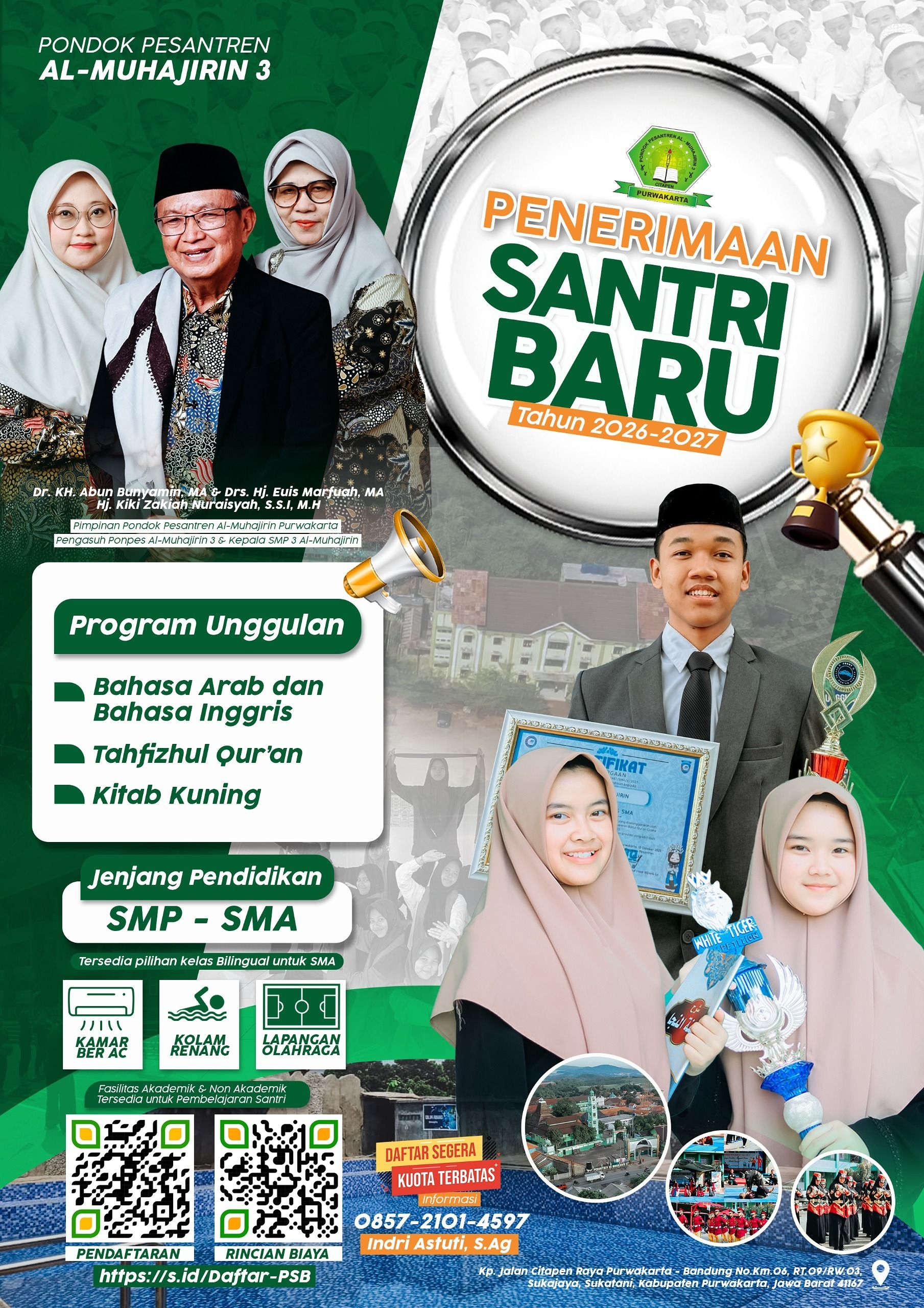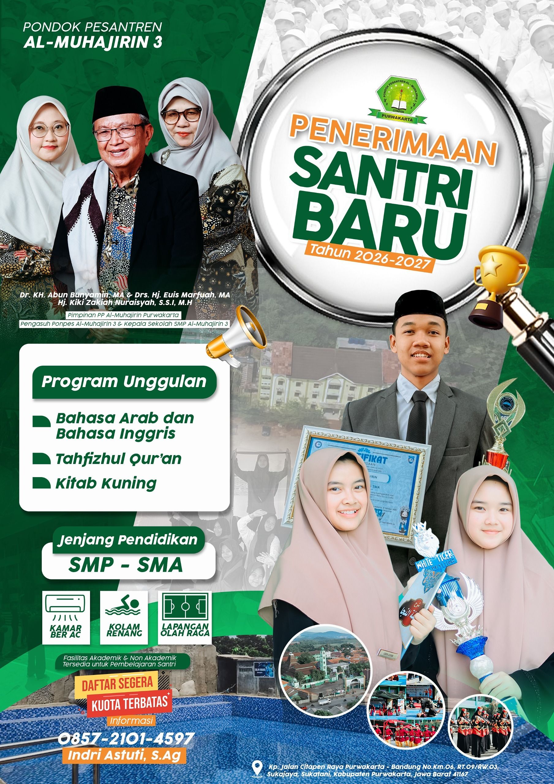 Purwakarta, Senin (05/01/2026) — Pondok Pesantren Al-Muhajirin 3 Purwakarta menyelenggarakan Apel Gabungan Pondok, SMP, SMK, dan SMA pada Senin pagi, 05 Januari 2026. Kegiatan ini berlangsung dengan khidmat dan penuh kebersamaan, diikuti oleh pimpinan pesantren, dewan asatidz dan asatidzah, serta seluruh santri dari berbagai jenjang pendidikan.A...